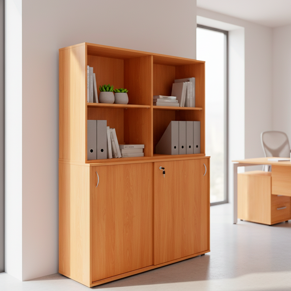 Biblioteca de diseño funcional y elegante, ideal para oficinas, bibliotecas, salas de reuniones o archivos. Fabricada en melamina de alta resistencia, cuenta con puertas correderas que optimizan el espacio frontal y mejoran la accesibilidad. Incluye dos repisas internas para almacenamiento eficiente de documentos, carpetas u objetos. Las terminaciones con tapacantos de PVC garantizan durabilidad y resistencia al uso diario. Equipada con cerradura con llave y duplicado para mayor seguridad.