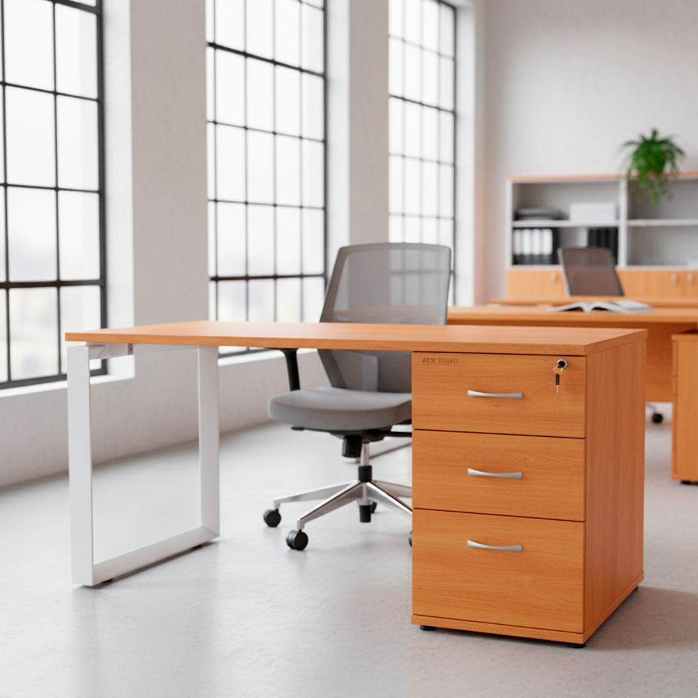 Escritorio con cubierta de melamina y tapacantos de PVC. 3 cajones con tiradores de acero y cerradura.