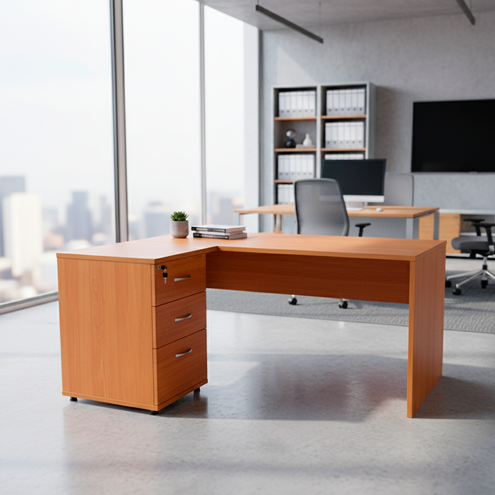 Este elegante escritorio en forma de L combina funcionalidad y estilo, ideal para espacios de trabajo que requieren amplitud y organización. Su cubierta en melamina de 24 mm de espesor, con tapacantos en PVC, ofrece resistencia y un acabado moderno. Incluye una cajonera pedestal con cuatro cajones, equipados con tiradores de acero en cromo satinado y cerradura centralizada para mayor seguridad. La estructura cuenta con rieles de cierre suave, garantizando un uso cómodo y silencioso. La base en patín de PVC proporciona estabilidad adicional. Diseñado para optimizar el espacio y facilitar la organización, es una excelente opción para oficinas o áreas de estudio.