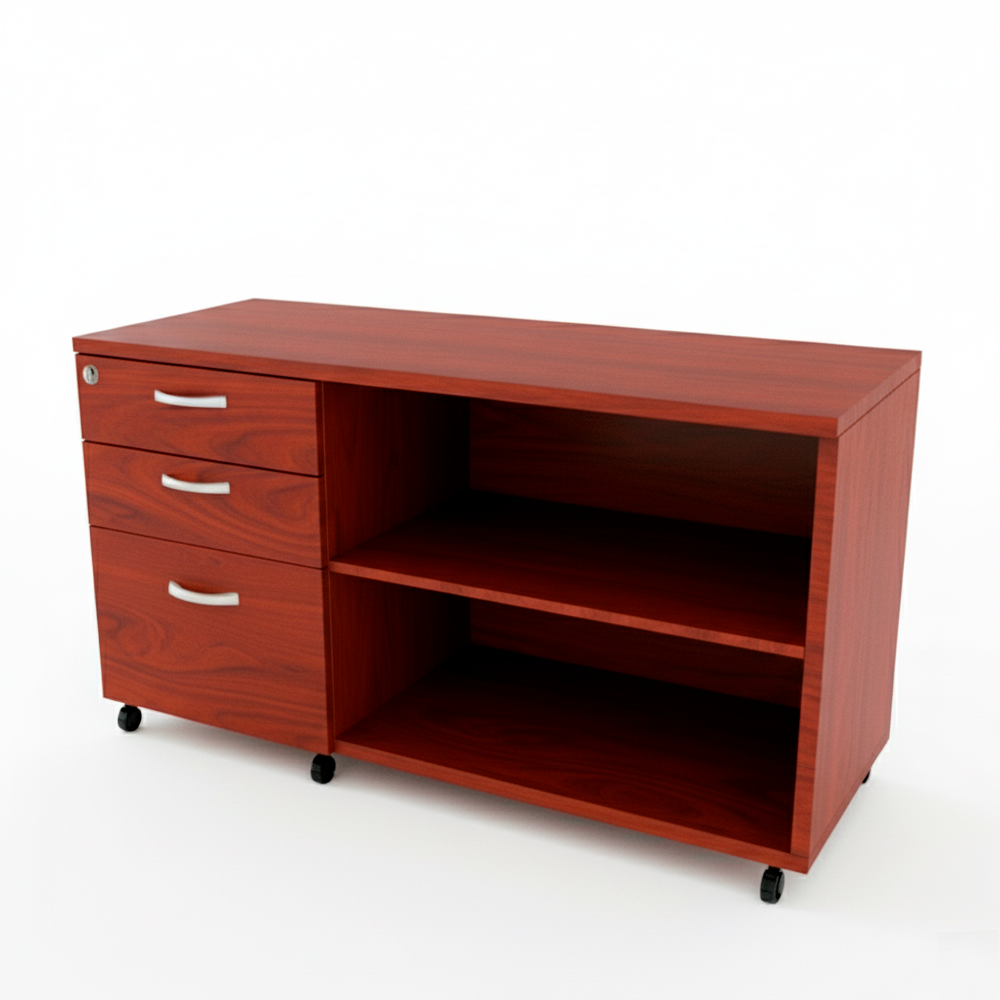 Estación de trabajo funcional y moderna, compuesta por un escritorio principal y una cajonera de retorno, diseñada para optimizar el espacio y ofrecer una superficie amplia y cómoda. Su estructura en aluminio electropintado color blanco proporciona resistencia y durabilidad, mientras que la cubierta de 24 mm de espesor garantiza firmeza y un acabado estético de alta calidad. La cajonera cuenta con dos cajones estándar y un cajón tipo kardex para archivo, todos con cerradura centralizada, y cuatro ruedas inferiores que facilitan su movilidad. Ideal para oficinas modernas que buscan diseño, ergonomía y funcionalidad.