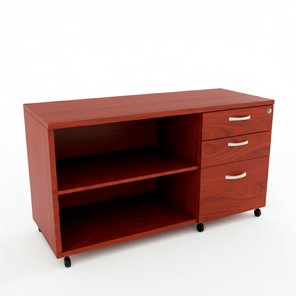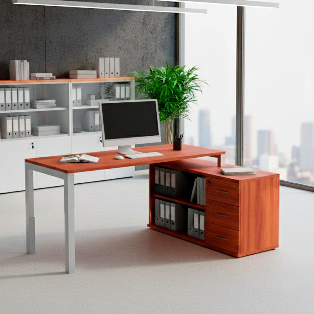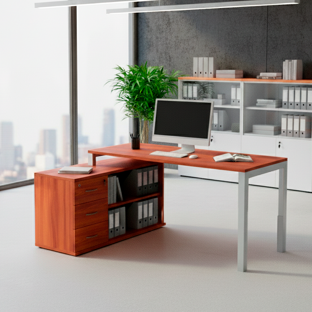 Estación de trabajo funcional y moderna, compuesta por un escritorio principal y una cajonera de retorno, diseñada para optimizar el espacio y ofrecer una superficie amplia y cómoda. Su estructura en aluminio electropintado color blanco proporciona resistencia y durabilidad, mientras que la cubierta de 24 mm de espesor garantiza firmeza y un acabado estético de alta calidad. La cajonera cuenta con dos cajones estándar y un cajón tipo kardex para archivo, todos con cerradura centralizada, y cuatro ruedas inferiores que facilitan su movilidad. Ideal para oficinas modernas que buscan diseño, ergonomía y funcionalidad.