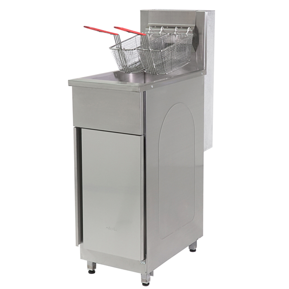 Equipada con dos canastillos de acero inoxidable, tiene una capacidad útil combinada de 3.6 kg de producto (referencia: papas congeladas prefritas), y está impulsada por tres quemadores de aluminio que aseguran una distribución de calor rápida y uniforme.