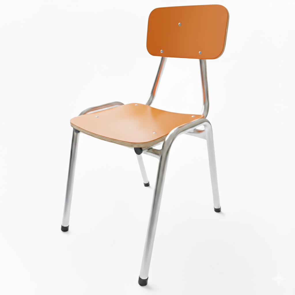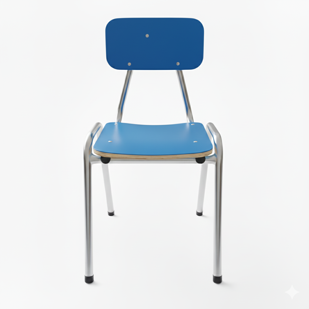 Silla resistente y funcional, diseñada para ambientes de alto uso como salas de clases, comedores, oficinas o espacios públicos. Su estructura metálica soldada con MIG y asiento en terciado enchapado en formalita garantizan durabilidad, estabilidad y fácil limpieza.